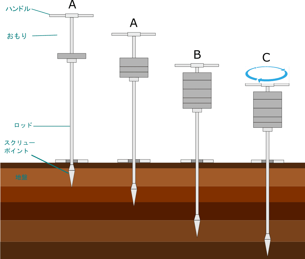 C ロッドを継ぎ足しながら、25cmずつ貫入させるのに要した回転数を記録していきます。通常、10mの深さに達するか、固い地層に達するまで続けます。