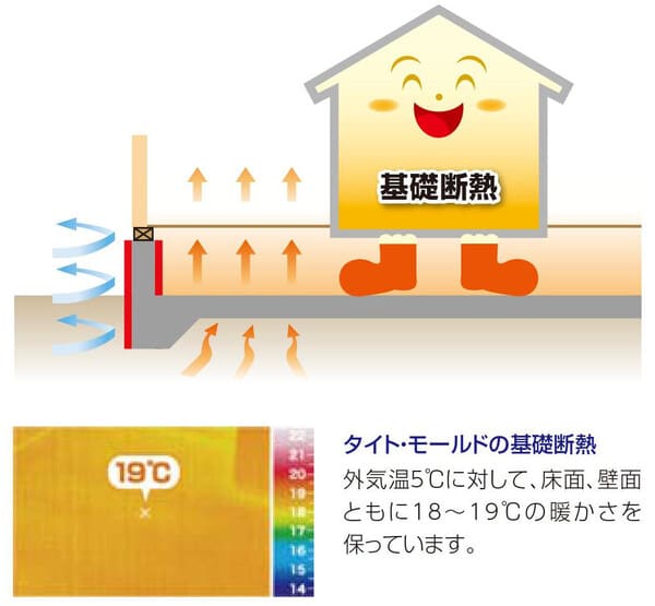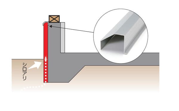 基礎に外張りされた断熱材は、シロアリにとって格好の標的となり、シロアリは基礎断熱の大敵でした。タイト・モールドは断熱材の素材にホウ酸を混ぜ合わせ、シロアリ被害から断熱材を保護。さらに断熱材の上にアルミ製の防蟻笠木を取り付けることでシロアリの侵入を二重で防ぐ対策を施しています。