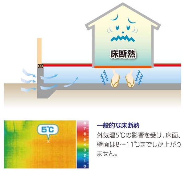 床下に大量のコンクリートを使用するベタ基礎は、外気温からの影響が床下全体に伝わり、コンクリートの性質上、熱(冷気・熱気)は蓄熱されます。長時間、床下の冷気(熱気)に触れている断熱材は、やがてその影響で冷たく(暖かく)なり、居室内の床に影響が現れます。